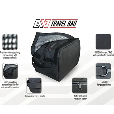 The Avert range of activated carbon bags is a new practical and secure means of transporting precious cargo. Odour-absorbing lining ensures you can travel safely without worry of leaking unwanted scents.